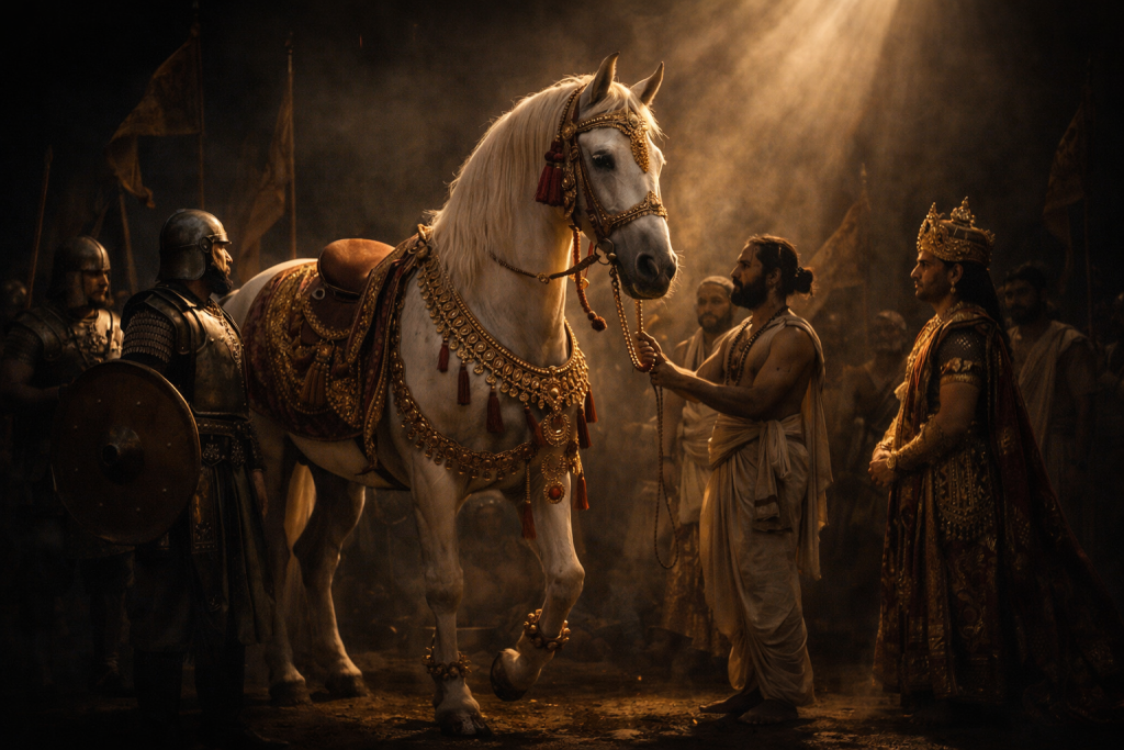 Ashwamedha Yagna represents outward sovereignty and unchallenged rule. Through the symbolic release of a sacred horse, it signifies territorial authority, military strength, and political supremacy. This yagna asserts dominance across lands, reflecting a ruler’s ability to protect, expand, and command, guided by ritual and royal power.